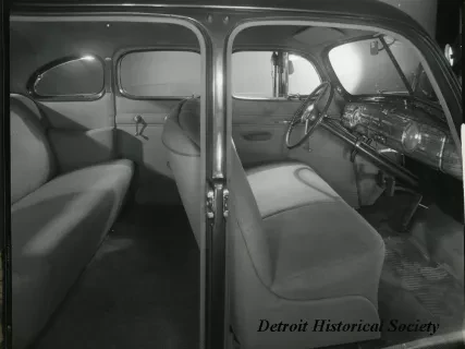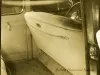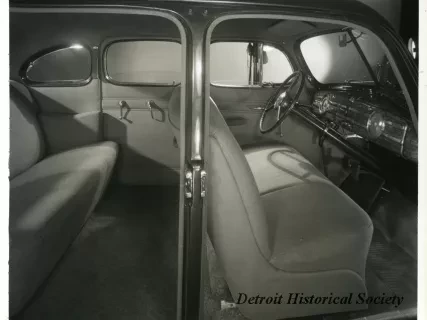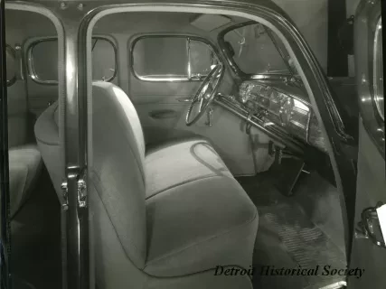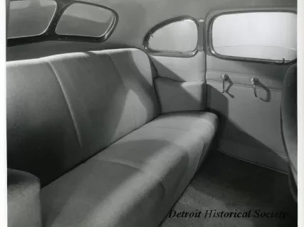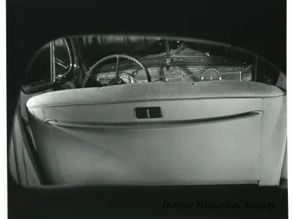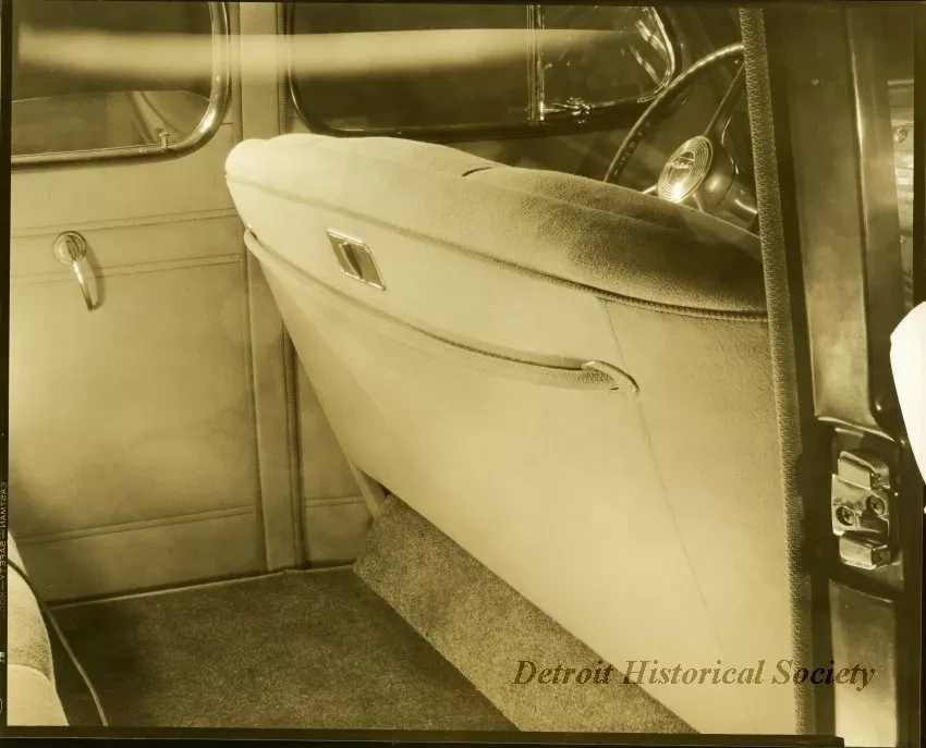 Sepia toned photographic print of the back of the front seat of a 1940 Packard 110/120 touring sedan, taken from the right side of the automobile.