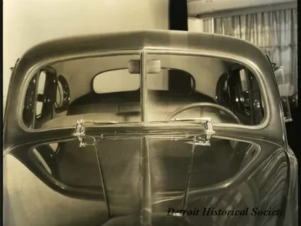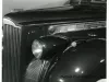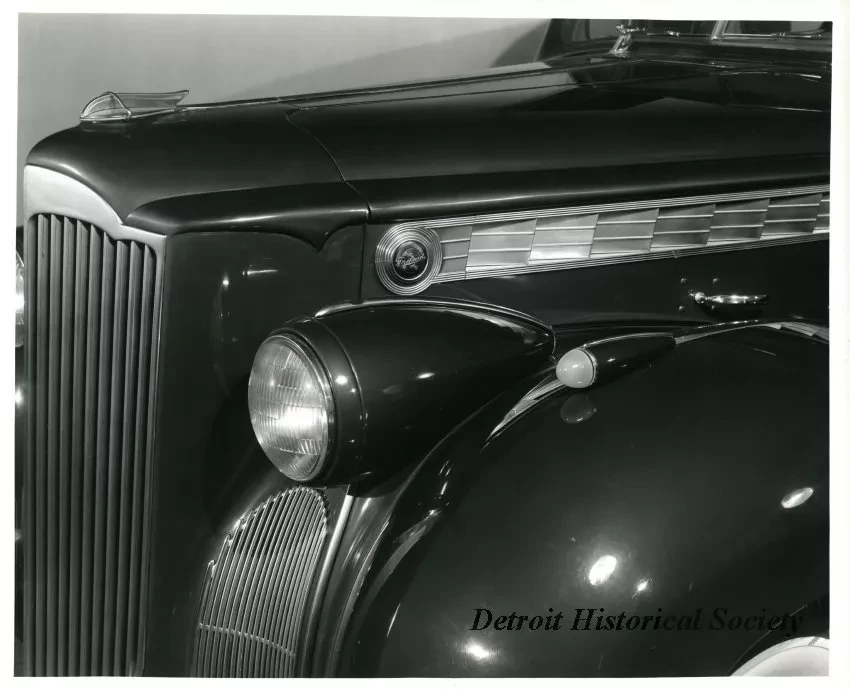Black and white photographic print of a close up shot of the front left portion of the front end of a Packard Motor Car Co. automobile, featuring the front left headlight, left side hood vents, and emblem.