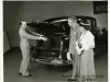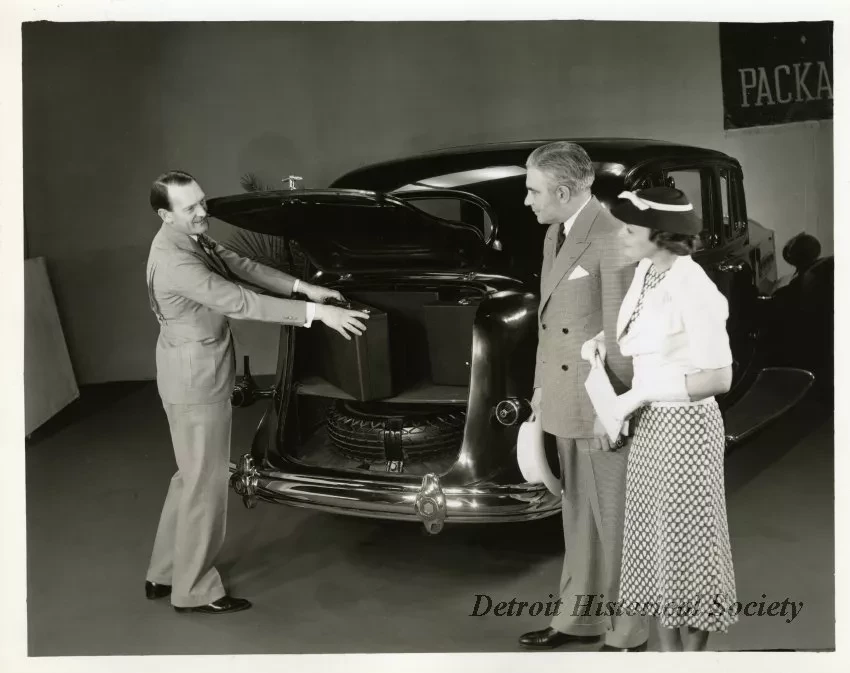 Black and white photograph of a rear and right side view of a Packard Senior Eight with the trunk open. A man standing to the right has his hands on a suitcase inside of the trunk, and a man and woman standing to the right are looking at the Packard. A spare tire is also visible inside the trunk.