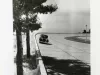 Black and white photograph of a front end view of a Packard Motor Car Co. automobile driving on the test track at the Packard Proving Grounds.