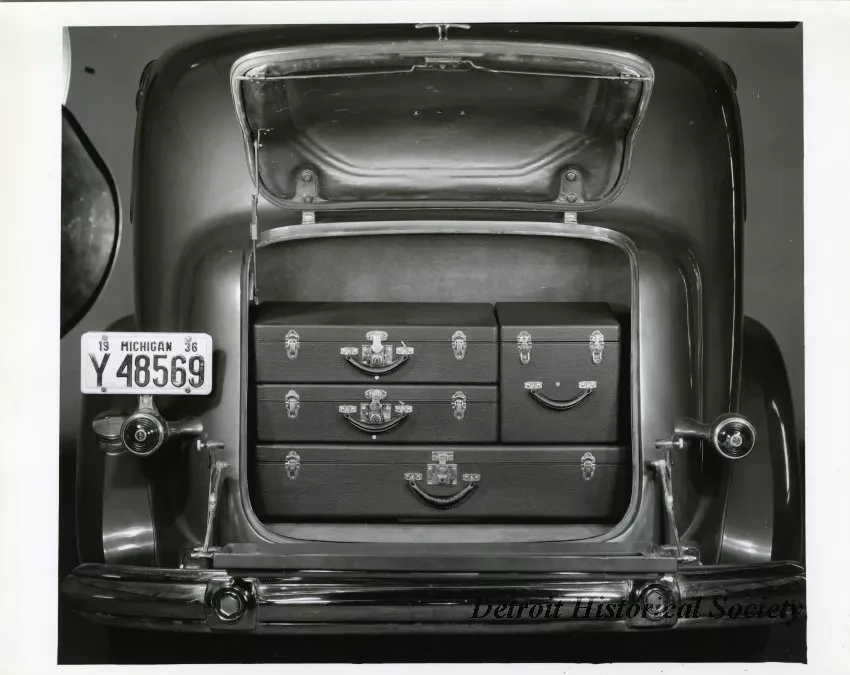 Black and white photograph of an interior view of the trunk of a 1936 Packard Motor Car Co. automobile, with Michigan license plate "Y 48569," with pieces of luggage stacked neatly inside.