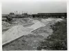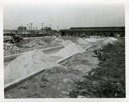 Black and white photograph of a construction site of a Packard Motor Car Co. road test track at Mt. Elliott St. and Harper Ave. Excavated road runs diagonally from the bottom left to the top right of the image, with several workers visible at the top right. Also visible in the back right are several train cars. Numerous Packard automobiles are parked in the back left.
