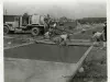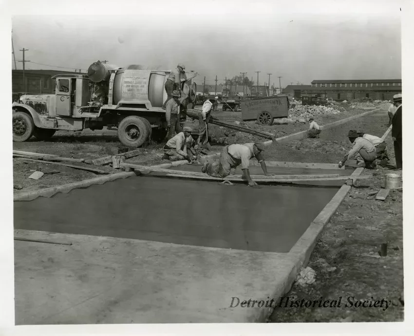 Black and white photograph of the construction site of a Packard Motor Car Co. road test track ad Mt. Elliott St. and Harper Ave. A cement truck from the Thomas E. Currie Co. is to the left, and numerous workers can be seen pouring cement into the excavated road. To the right of the cement truck is a wagon labelled "Sachs & Lodewyk Concrete CAD 1489." Packard automobiles are parked in the back left.