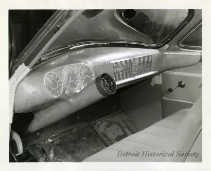 Black and white photograph of a side view of the interior of a Packard Motor Car Co. automobile, showing the front seat, dashboard, and windshield. The interior is unfinished, with the steering wheel and floor components missing. The photograph was taken through the front left door of the automobile.