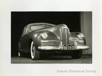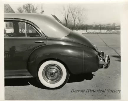Black and white photograph of a left side profile view of the back end of a 1941 Packard 120, which is parked at the Packard Proving Grounds.