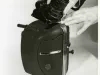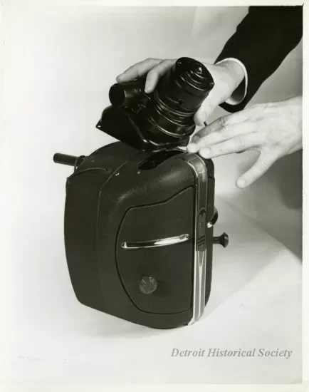 Black and white photograph of an angled view of a Packard Deluxe heater, with a pair of hands holding the top of the heater.