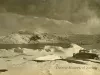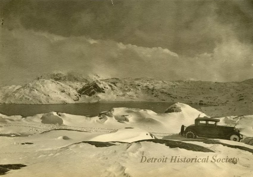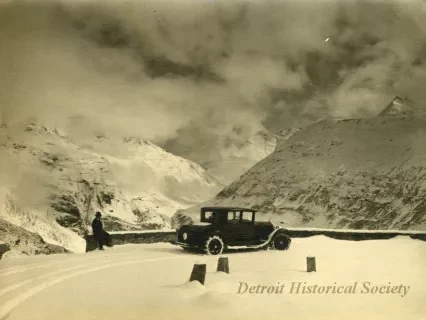 Black and white photograph of a right side view of a Packard Motor Car Co. automobile being driven on snow covered road in a mountainous region next to a body of water.