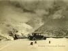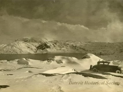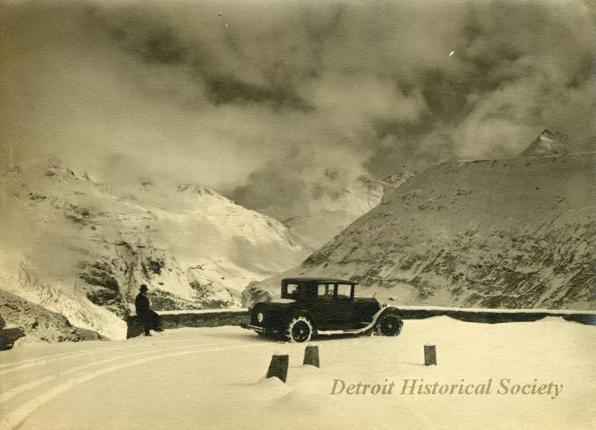 Black and white photograph of a back and right side view of a Packard Motor Car Co. automobile parked on a snow covered road in a mountainous region. A man is sitting on a cement ledge to the left of the Packard.