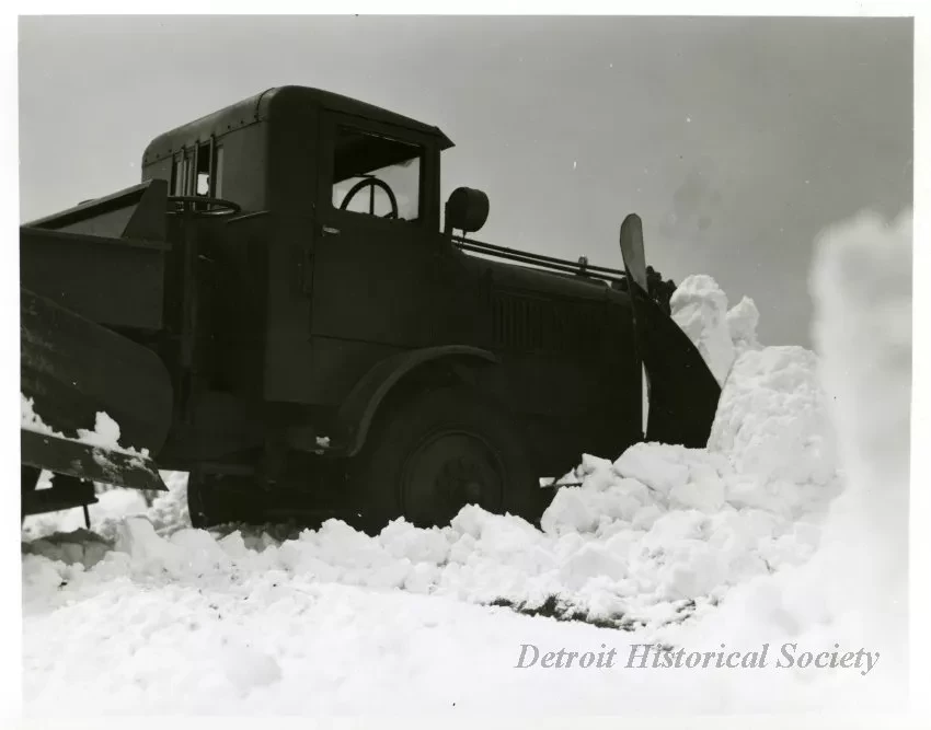 Black and white photograph of a right side view of a snow plow at the Packard Proving Grounds.