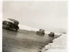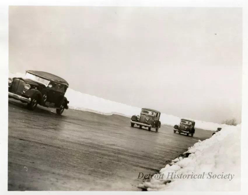 Black and white photograph of three Packard Motor Car Co. automobiles on the test track at the Packard Proving Grounds. The ground surrounding the test track is covered with snow.