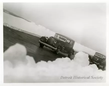 Black and white photograph of front and left side views of two Packard Motor Car Co. automobiles on the test track at the Packard Proving Grounds. The ground bordering the track is covered with snow.