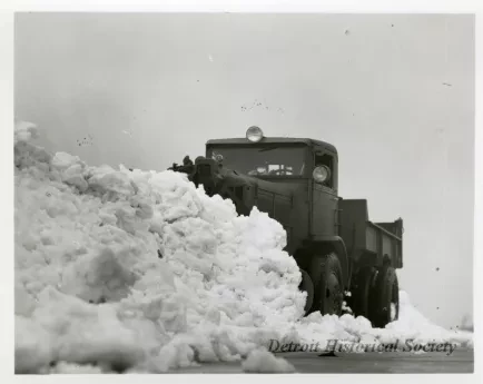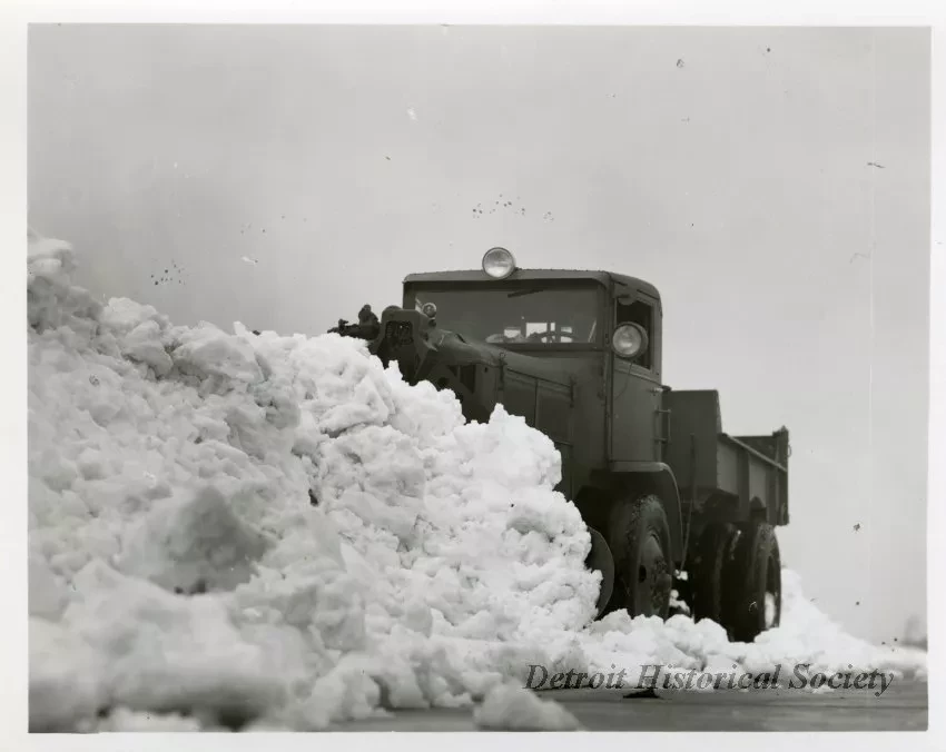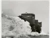 Black and white photograph of a front and left side view of a snow plow at the Packard Proving Grounds.