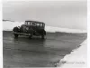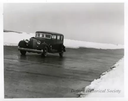 Black and white photograph of a front and left side view of a Packard Motor Car Co. automobile on the test track at the Packard Proving Grounds. The ground bordering the track is covered with snow.