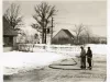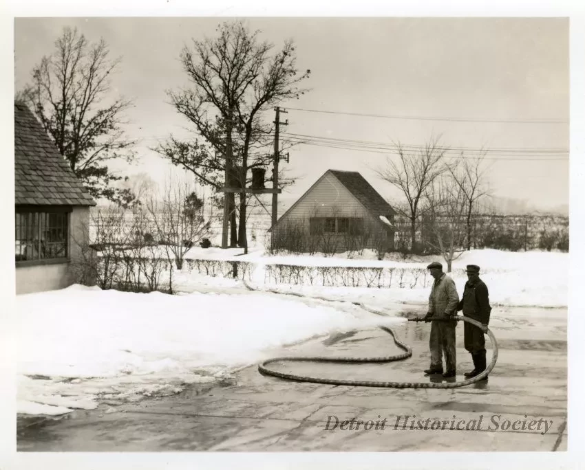 Black and white photograph of two men holding a hose which is spraying water on the ground at the Packard Proving Grounds.