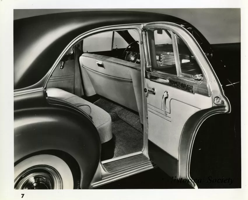 Black and white photograph of a rear right side view of a Packard Motor Car Co. automobile. The interior of the automobile is visible through the open right rear door. The photograph is marked with the number "7" on the bottom left.