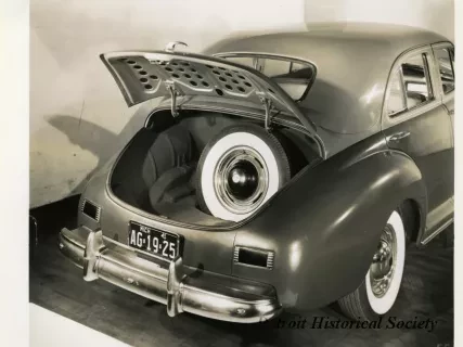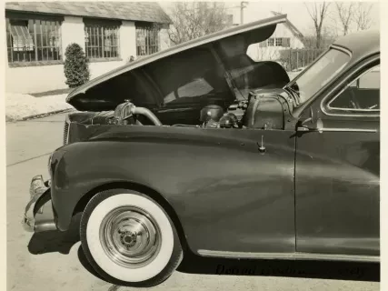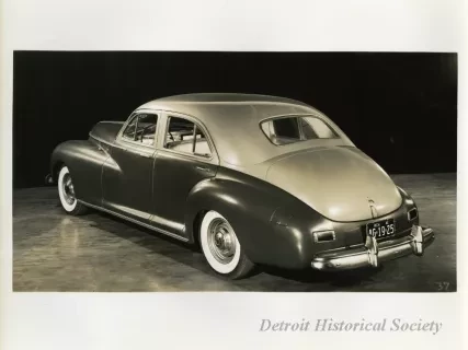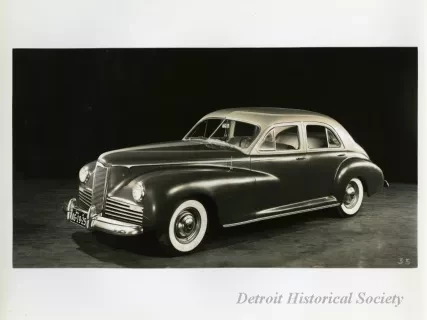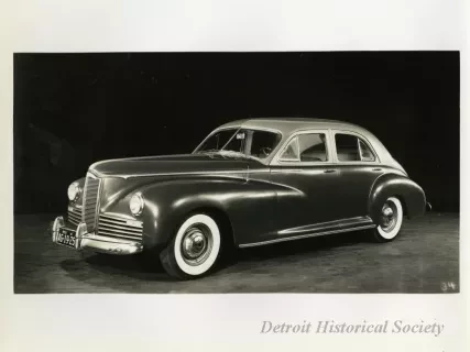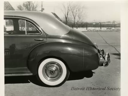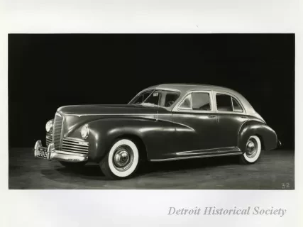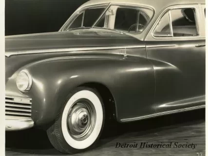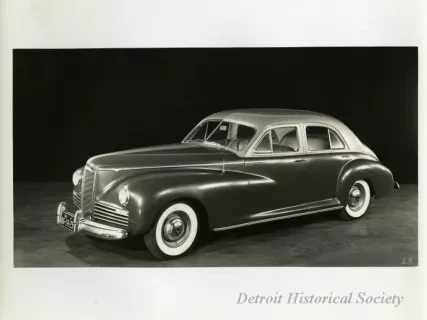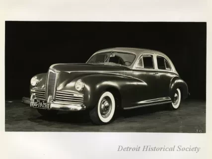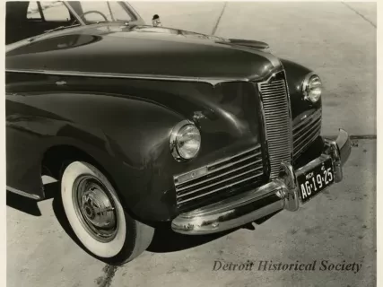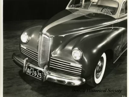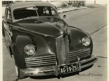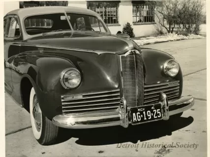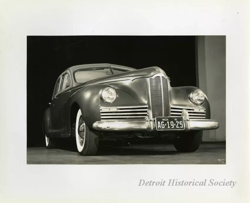 Black and white photograph of a low profile front end and right side view of a 1941 Packard 120, with Michigan license plate "AG 19 25." The photograph is marked with the number "76" on the bottom right.