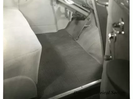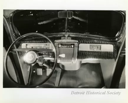 Black and white photograph of the dashboard and windshield of a Packard Motor Car Co. automobile, taken from the front seat of the automobile and angled toward the front.