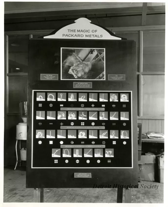 Black and white photograph of a Packard Motor Car Co. display board, "The Magic of Packard Metals," featuring the thirty three steels used in Packard construction and some of the methods by which the steel is processed.