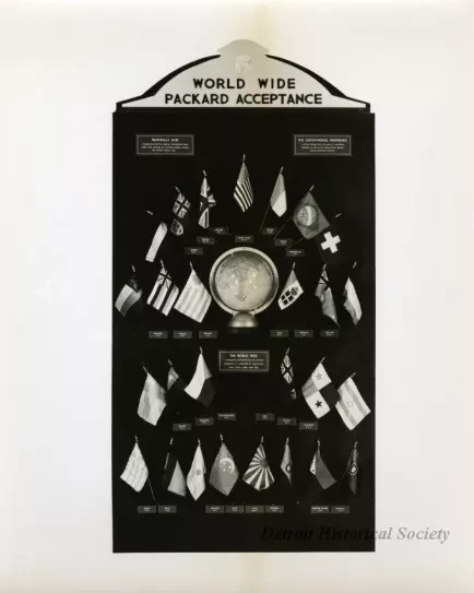 Black and white photograph of a Packard Motor Car Co. display board, "World Wide Packard Acceptance." A text box at the top left reads "TRUTHFULLY SAID - Packard has built for itself an international reputation and occupies the pinnacle position among the world's famous cars." A text box at the top right reads "THE OUTSTANDING PREFERENCE - of the foreign fine car owner in sixty-three countries, as well as the choice of the discriminating American motorist." A text box in the center, underneath a globe, reads "THE WORLD WIDE - recognition of Packard over its principal competitors is indicated by registration ratios shown under each flag." The flags and ratios of 27 countries are displayed.