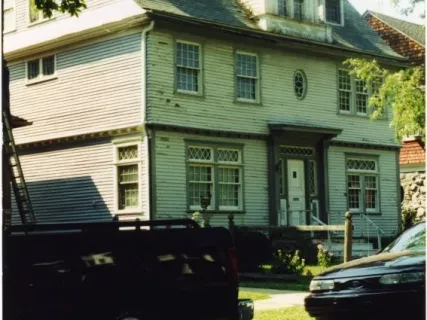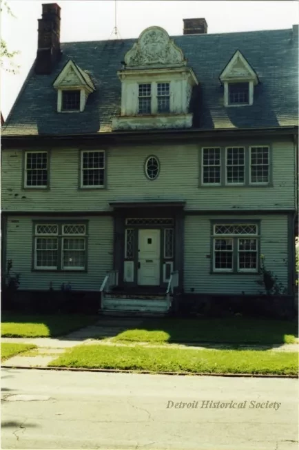 Color photograph taken of the front face of the Julius T. Melchers House at 723 Seyburn Street, prior to its restoration. The paint on its wooden siding and its the carved gable is worn.