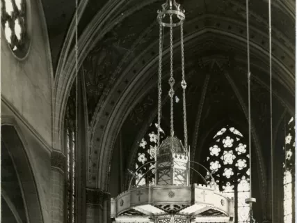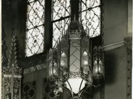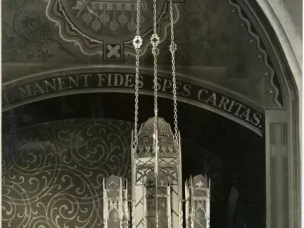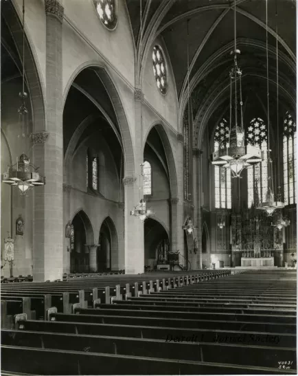 Black & white photographic print depicting the inside of St. Florian Catholic Church in Hamtramck, looking from the nave towards to apse.