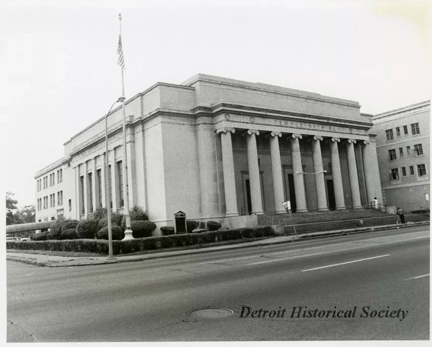 Black & white photographic print depicting Temple Beth El on the northwest corner of Woodward and Gladstone Avenues.