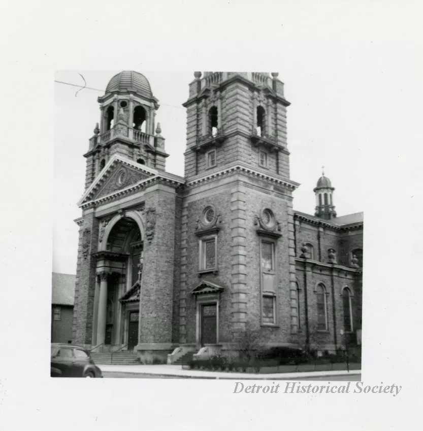 Black & white photographic print depicting St. Francis D'Assisi Catholic Church on the northeast corner of Wesson and Buchanan Streets.
