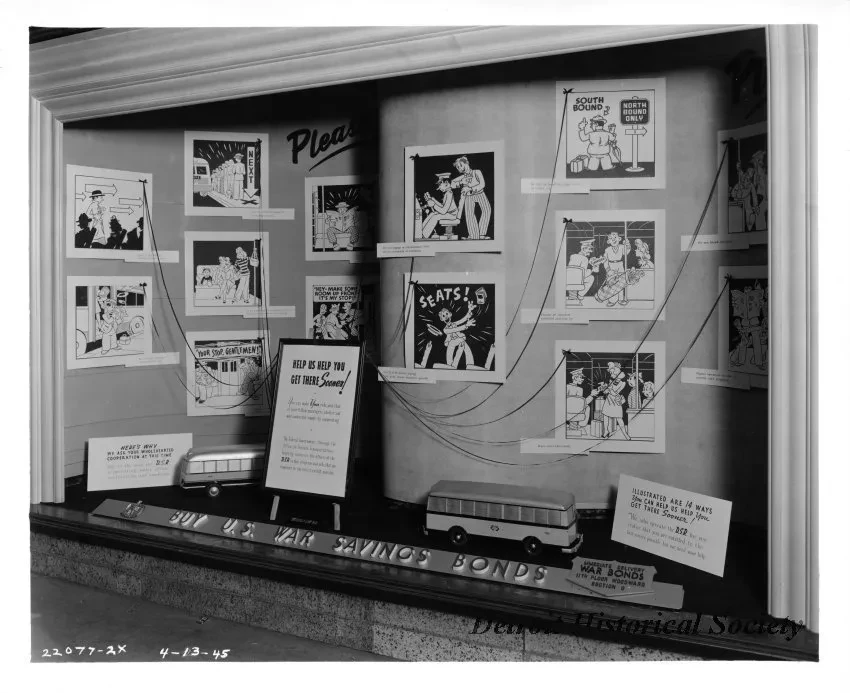 Print. Black and white photographic print of a window display at J.L. Hudson Company Department Store. 14 Cartoon images are affixed to the rear of the display each noting differing types of service improvements a customer could have on the Department of Street Railways. Signage, with affixed ribbons leading toward the rear drawings reads, "Help Us Help You Get There Sooner! You can make Your ride, and that of your fellow-passengers shorts, and more comfortable simply by cooperating. The Federal Government through the Office of Defense Transportation, heartily endorses the efforts of the D.S.R. in this program asks that you cooperate to the fullest extent possible." Small, bus models flank the signage. Signage affixed to the bottom foreground of the display reads, "Buy U.S. War Savings Bonds, Immediate Delivery, WAR BONDS, 11th Floor, Woodward, Section D." The photographic sequence number and date are printed on the bottom of the recto, "22077-2x; 4-13-45."