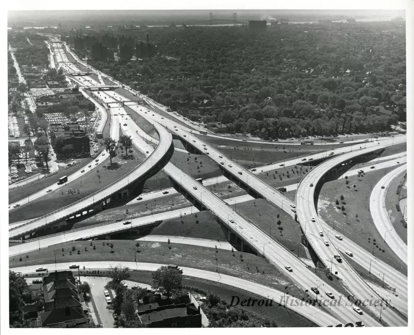 Black & white photograph depicting an aerial view of the Edsel Ford Freeway and John C. Lodge Freeway interchange, looking south. In the background are the Jeffries Housing Projects and Ambassador Bridge.