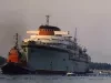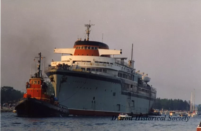 One color photograph of the cruise ship, Aquarama, being towed out of the harbor at Muskegon, Michigan. The photo shows a port side bow view of the rusting ship which is under tow with the tugboat, Tusker, at the bow and another at the stern. Spectators can be seen on various pleasure craft in the right foreground and background. The ship was being towed to Sarnia, Ontario. On the verso, handwritten text in blue ink shows "being towed out of Muskegon" and "photo by Roxy Wienand."