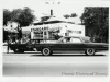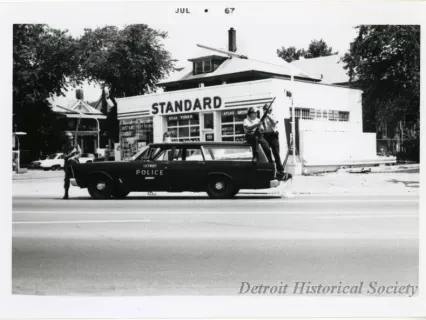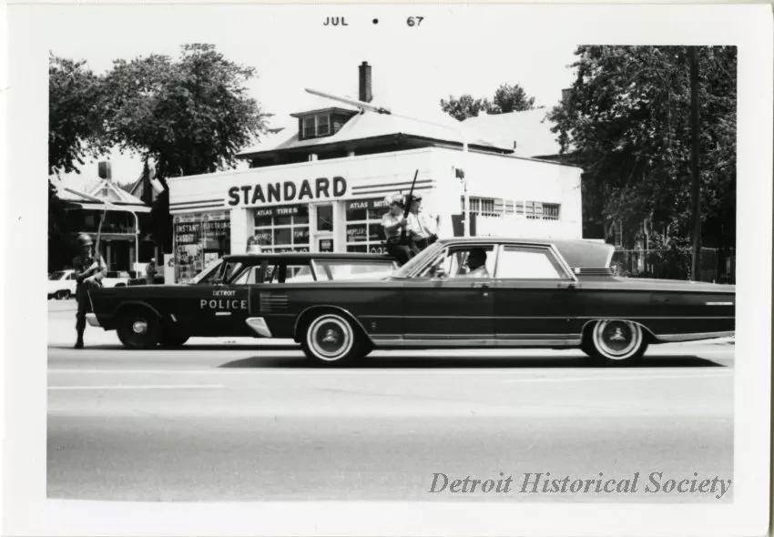 Black and white photo of a Standard service station with a Detroit Police vehicle parked in front of it. On the car is a National Guard service man sitting on the front with two armed men on the back. A man is driving past them. "Jul 67" is printed in the photo's border.