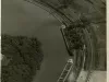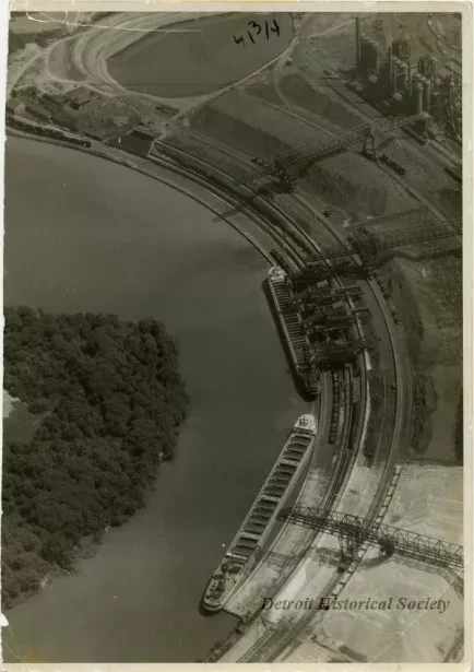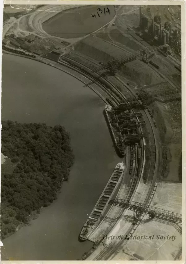 One black and white photograph of the National Tube Company division of the U. S. Steel Corporation in Lorain, Ohio. The aerial view looks across the Black River toward the steel works complex. Two freighters are moored at a dock in the lower foreground. Four Hulett unloaders are unloading iron ore from the hold of one freighter while the other waits to unload limestone. Large iron ore piles are visible between the dock and the steel works. Handwritten pencil text on the verso shows "Lorain, Ohio," and "National Tube."