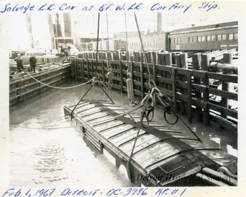 One black and white Polaroid photograph of a sunken railroad boxcar at the Grand Trunk Railroad car ferry dock in Detroit. The photo looks downstream and shows the Detroit River in the foreground as well as two steel cable slings which are being used to raise the submerged car. The side of a crane barge from the Dunbar & Sullivan Dredging Company is visible at the far left side of the photo. A new timber seawall can be seen at the center and right side of the photo. Railroad cars can be seen on the adjacent shore in the background. Handwritten blue ink text on the upper and lower edges of the photo reads "Salvage R.R. Car at G.T. W. R.R. Car Ferry Slip. Feb. 1, 1967, Detroit - DC 3986 AR#1."
