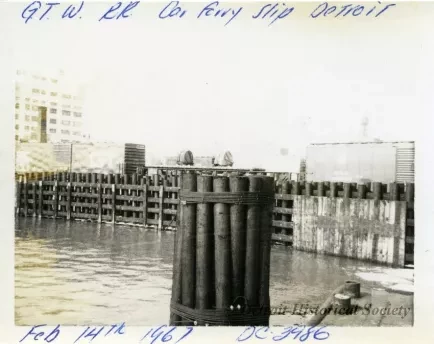 One black and white Polaroid photograph of a section of the Grand Trunk Railroad car ferry dock in Detroit which is being repaired by the Dunbar & Sullivan Dredging Company. The photo looks downstream and shows a mooring pile cluster in the foreground as well as the Detroit River. New pilings and cross timbers for a reconstructed seawall can be seen across the center of the photo. Railroad cars can be seen beyond the seawall and the Robin Hood Flour plant is visible in the far left background. Handwritten blue ink text on the upper and lower edges of the photo reads "G.T.W. R.R. Car Ferry Slip, Detroit, Feb. 14th, 1967, DC-3986."