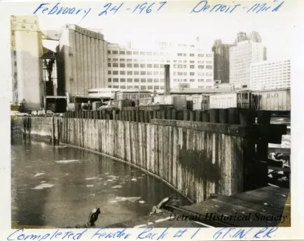 One black and white Polaroid photograph of a section of the Grand Trunk Railroad car ferry dock in Detroit which has been repaired by the Dunbar & Sullivan Dredging Company. The photo looks downstream and shows the Detroit River and ice floes in the foreground as well as new pilings and timbers for the reconstructed seawall. Railroad cars can be seen on the adjacent shore and the Robin Hood Flour plant is visible in the background. Handwritten blue ink text on the upper and lower edges of the photo reads "February 24, 1967, Detroit, Mich., Completed Fender Rack #1, G.T.W. R.R."