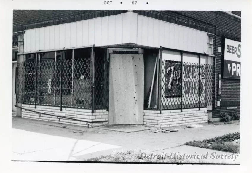 One black and white photograph (and one copy) of the Grand Discount Patent Medicines store (former S&M Drug store) located at the southwest corner of Grand St. and Linwood Ave. in Highland Park. The photo shows an exterior view of the store and the doorway which was boarded due to the unrest of July 1967.