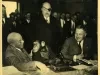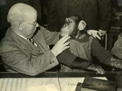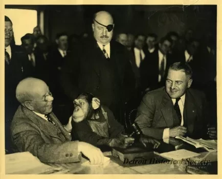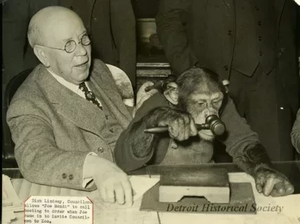 One sepia-toned photograph of the entertainer chimpanzee, Joe Mendi II, at the Detroit Common Council. Detroit City Councilman, Richard Lindsay, is seated at the far left with Councilman, Eugene Van Antwerp, seated at the far right. The man with the eye patch who is standing in the background may be Detroit Zoo Director, John T. Millen. The chimpanzee was purchased for the Detroit Zoo by the Zoo Director in 1932. "Joe Mendi" was a popular attraction at the Zoo and he lived there until his death on September 8, 1934. Embossed text in the lower right corner of the photo shows "The Detroit News, Detroit, Mich."