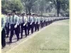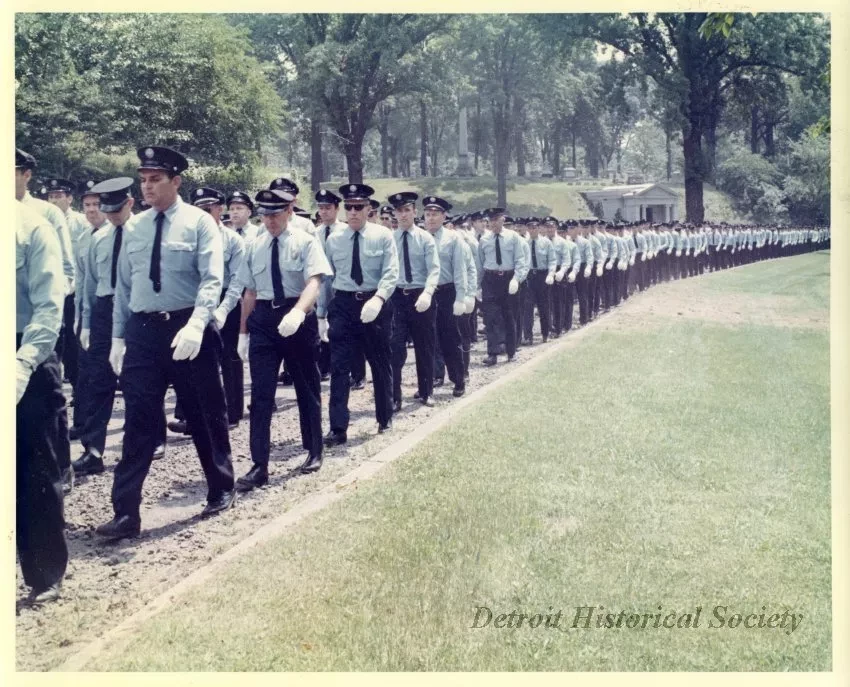 One color photograph of a funeral procession for one of two Detroit Fire Department firemen who died as a result of the riots which had taken place in the city in late July, 1967. The photo shows lines of firemen who are walking along a roadway in a cemetery (probably Elmwood). Many large trees are visible in the background along with headstones and monuments. A red ink stamp on the verso shows "D.F.D. [Detroit Fire Department] Photo, by Capt. J. A. Mancinelli."
