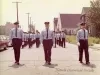 One color photograph of a funeral procession for one of two Detroit Fire Department firemen who died as a result of the riots which had taken place in the city in late July, 1967. The photo shows three lieutenants or captains who are walking and leading six lines of firemen along a city street. A church, house, buildings, and parked cars are visible in the background. A red ink stamp on the verso shows "D.F.D. [Detroit Fire Department] Photo, by Capt. J. A. Mancinelli."