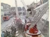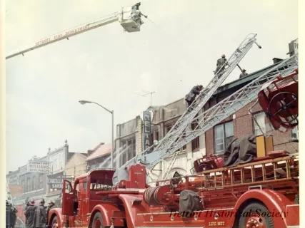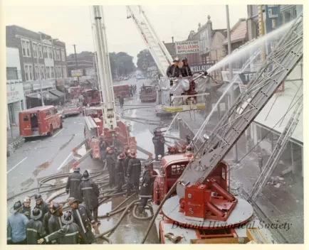 One color photograph of Detroit firemen who are trying to extinguish a blaze at a row of buildings located on 12th Street between Taylor and Clairmount Streets. The photo shows many fireman at work with aerial and ladder trucks. The buildings had been set on fire during the 1967 Detroit Riot. Businesses shown in the photo include Reed's Custom Tailoring, Jack's Esquire Men's Wear, Williams Furniture and Appliances, Cancellation Shoes, and the Reliable Rug Company. A red ink stamp on the verso shows "D.F.D. [Detroit Fire Department] Photo, by Insp. Barney Wasowicz."