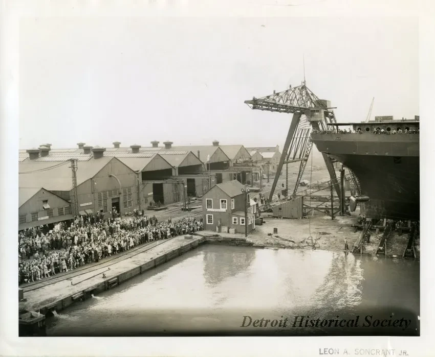 One sepia-toned photograph of the bulk carrier, A. H. FERBERT, at the Great Lakes Engineering Works shipyard in River Rouge, Michigan. The photo shows an elevated view of the shipyard and the starboard side stern section of the ship as it rests in the slipway prior to launch. Workmen and spectators are standing along the taffrail of the ship. Open water is visible in the foreground. Yard buildings and a large crowd of spectators can be seen in the left background. A black ink stamp at the lower right edge of the photo reads "Leon A. Soncrant, Jr." A black ink stamp on the verso reads "Photograph by Leon A. Soncrant, Jr., 300 Second St., Wyandotte, Mich." Adjacent handwritten black pencil text reads "#6."