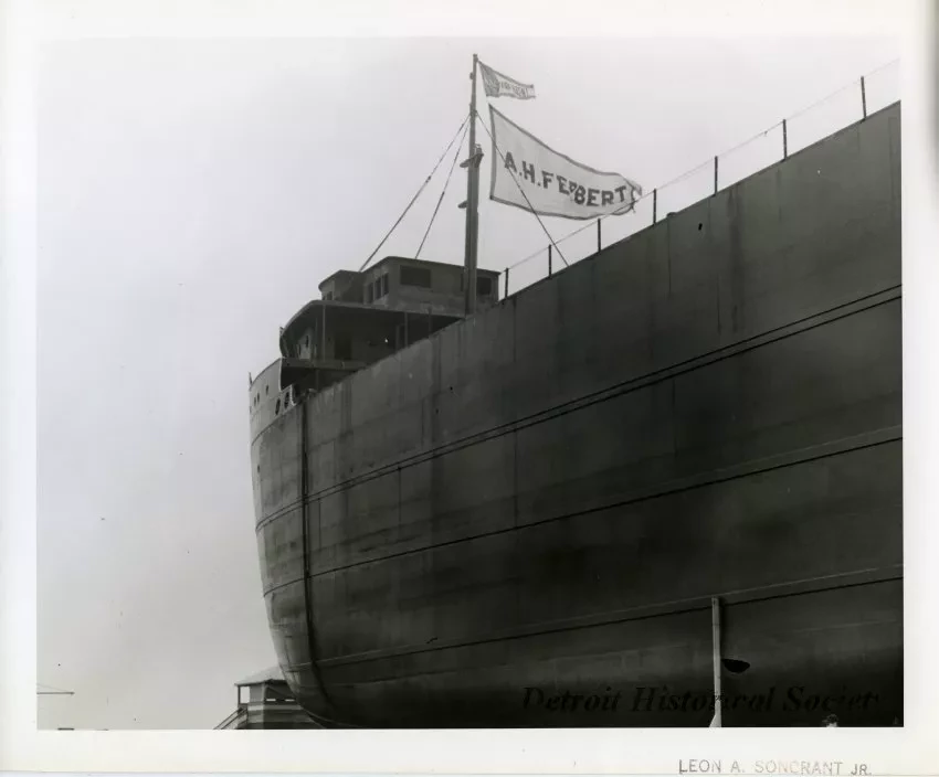 One sepia-toned photograph of the bulk carrier, A. H. FERBERT, at the Great Lakes Engineering Works shipyard in River Rouge, Michigan. The photo shows a port side view of the forward section of the ship as it rests in the slipway prior to launch. A covered platform for the viewing and ceremonial launching of the ship is visible near the lower edge of the bow. A black ink stamp at the lower right edge of the photo reads "Leon A. Soncrant, Jr." A black ink stamp on the verso reads "Photograph by Leon A. Soncrant, Jr., 300 Second St., Wyandotte, Mich." Adjacent handwritten black pencil text reads "#7."