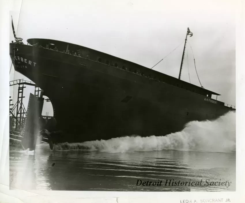 One sepia-toned photograph of the bulk carrier, A. H. FERBERT, at the Great Lakes Engineering Works shipyard in River Rouge, Michigan. The photo shows a starboard side view of the stern section of the ship as it moves sideways off the slipway and into the water with a large splash. Workmen and spectators can be seen standing along the taffrail of the ship. Open water is visible in the foreground and a portion of the slipway is visible at the far left side of the photo in the background. A black ink stamp at the lower right edge of the photo reads "Leon A. Soncrant, Jr." A black ink stamp on the verso reads "Photograph by Leon A. Soncrant, Jr., 300 Second St., Wyandotte, Mich." Adjacent handwritten black pencil text reads "#9."