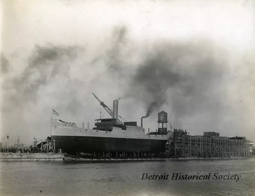 One sepia-toned photograph of the cargo ship, LAKE LILICUSUN (Hull #134), at the Saginaw Ship Building Company yard in Bay City, Michigan. The photo shows a port side view of the ship which is resting in a slipway just prior to launch. Workmen and visitors are standing on the dock and platforms near the bow and stern of the ship. Another ship is under construction at the far right side of the photo and the Saginaw River is visible in the foreground. Handwritten text on the verso reads "Nov. 27, 1918."
