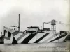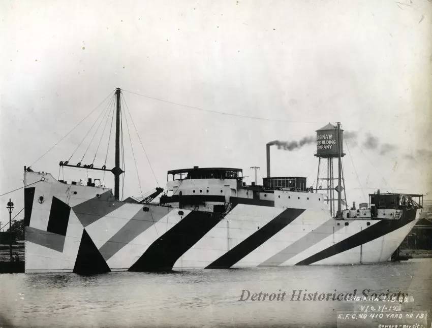 One sepia-toned photograph of the cargo ship, LAKE OSWEYA (Hull #131), at the Saginaw Ship Building Company yard in Bay City, Michigan. The photo shows a port side view of the ship which is moored at a dock in the shipyard. Workmen are proceeding with fitting out work on the deck. Dazzle painting has been used on the hull for camouflage. Handwritten text in the lower right corner reads "Saginaw Ship Bldg. Co., 8/23/18, E.F.C. [Emergency Fleet Corporation] #410, Yard #131, Bowers - Bay City."