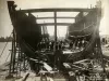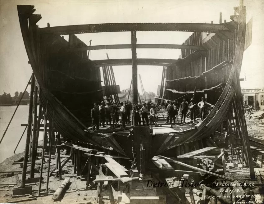 One sepia-toned photograph of the cargo ship, LAKE WINOOSKI (Hull #132), under construction at the Saginaw Ship Building Company yard in Bay City, Michigan. The photo shows a view along the inside of the partially-constructed hull. Workmen are standing on the lower deck and appear to be posing for the photo. The Saginaw River is visible in the left background and shipyard buildings are visible in the right background. Handwritten text in the lower right corner reads "Saginaw S. B. Co., 7/27/18, E.F.C. [Emergency Fleet Corporation] No. 411, Yard No. 132, Bowers - Bay City."
