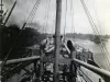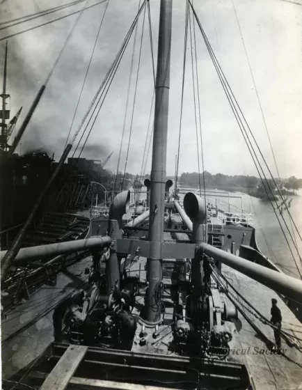 One sepia-toned photograph of a cargo ship at the Saginaw Ship Building Company yard in Bay City, Michigan. The photo shows an aft-facing view along the main deck of the unidentified ship which is moored at a dock in the shipyard. Workmen are completing fitting out work on the deck. Shipyard facilities are visible in the left background area of the photo and the Saginaw River is visible in the right background.