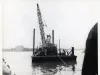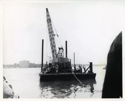 One black and white photograph of an underwater telephone cable being laid across the Trenton Channel of the lower Detroit River. The photo shows a Dunbar & Sullivan Company barge with a crane and cable reel in the foreground. The Trenton Tower apartment building (located on Riverside Drive between St. Joseph and Elm Streets) is visible on the Trenton shoreline in the left background.