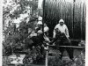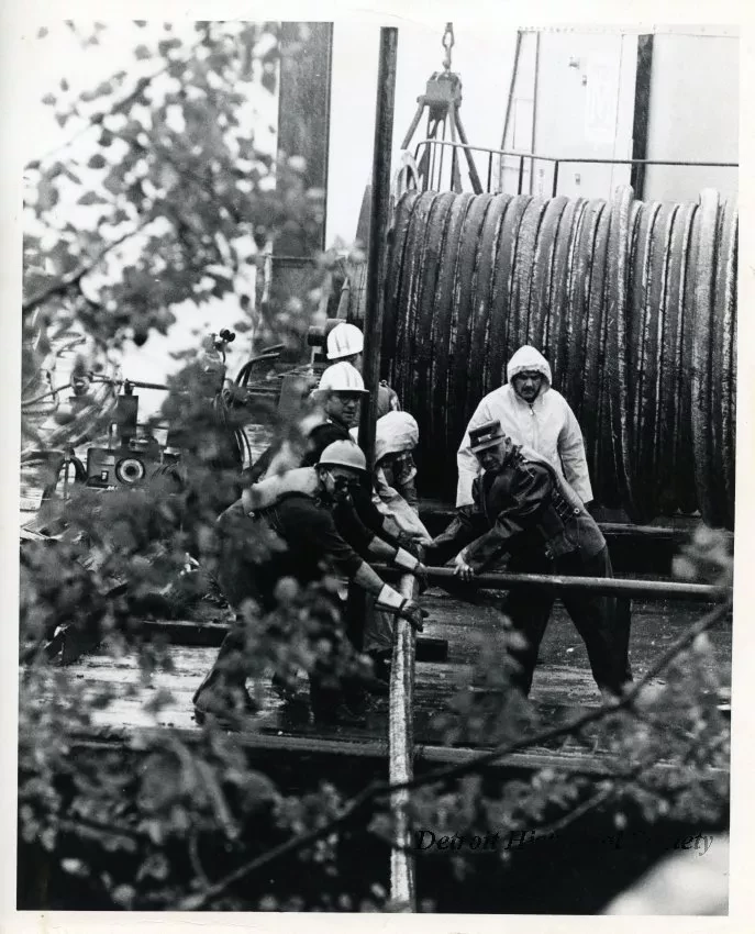 One black and white photograph of an underwater telephone cable being laid across the Trenton Channel of the lower Detroit River. The photo shows a Dunbar & Sullivan Company barge with a crane and cable reel in the background. Several workmen on the barge deck are helping to pass the cable over a guide bar to other workmen onshore. Branches of a small tree can be seen in the foreground.