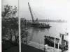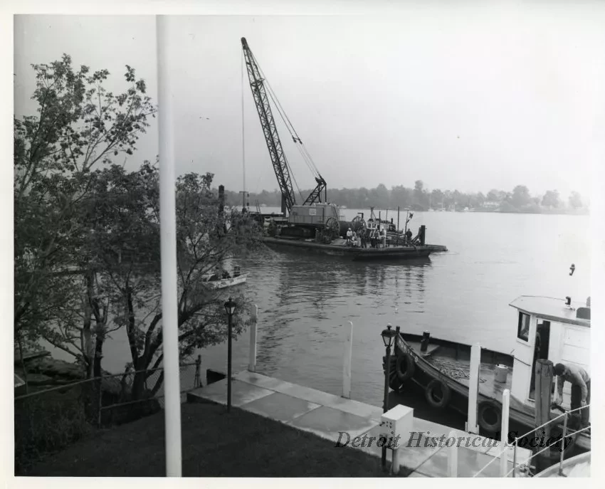 One black and white photograph of the work operations for laying an underwater telephone cable across the Trenton Channel of the lower Detroit River. The photo shows a Dunbar & Sullivan Dredging Company barge with a cable reel and crane. Cable is unwinding from the reel and is passing over a guide bar before entering the river. Groups of workmen are standing or seated on the barge deck, and the tugboat, Paddy Miles, is moored alongside. In the foreground, a flagpole, a dock, and the small tugboat, Norma B, are visible. The Grosse Ile shoreline is visible in the background.